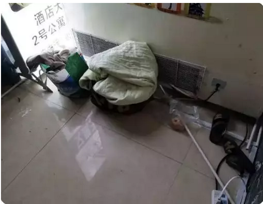 在万达2号公寓大厅内,自动贩卖机后有一块空地,这是小龙的”储藏室“放置着他的“全部家当”:一床薄被,几件衣服,一个苹果,一双拖鞋....