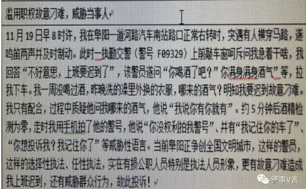 2018年11月19日15时,阜阳市公安局收到一条群众网络投诉(投诉人注明,愿意公开该条投诉内容),原文如图: