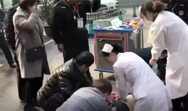 因为病情危急,加之老人当时已经躺在地上,不宜对老人的身体再做大幅度的搬动,以免加重病情,只能选择在原地进行紧急抢救。这种情况下,护士刘玉萍立即跪在老人的身旁,在医护人员及保安员等人的全力配合下,对老人实施心肺复苏。