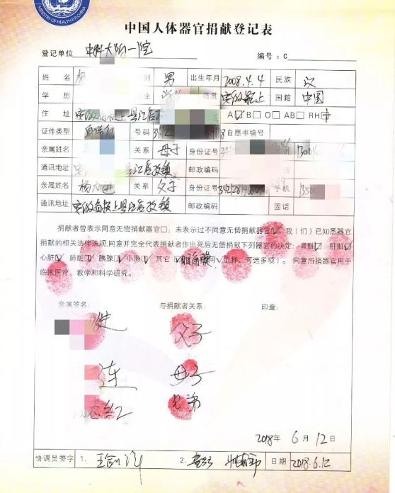 入院后一直处于深昏迷状态,6月11日再次出现心跳骤停,患儿家属经与医生沟通得知救治无望,主动提出愿意捐献亲人器官去救助他人,去挽救其他即将破碎的家庭。在OPO人员协助下,6月12日,家属签署了《中国人体器官捐献登记表》,明确表达愿意捐献所有器官的意愿。